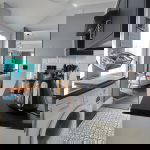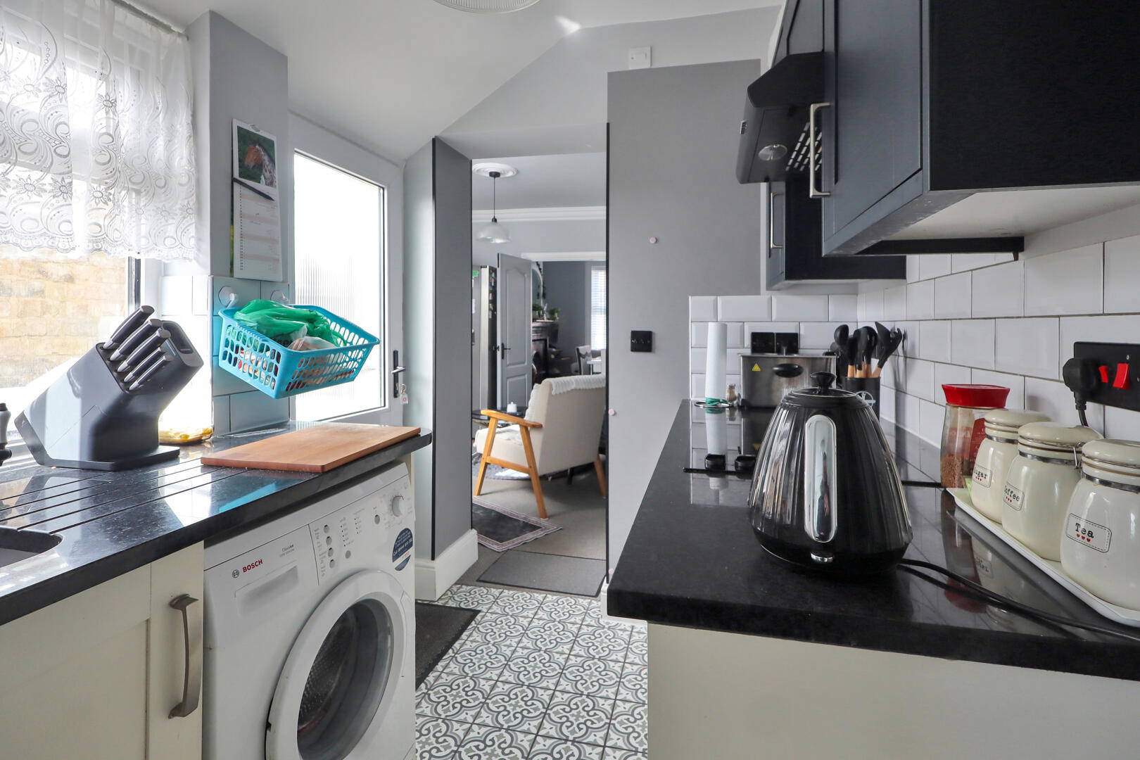 Compact yet thoughtfully designed, the kitchen provides efficient workspace with black countertops and a white subway tile splashback. It includes modern appliances and cabinetry in a two-tone finish. A useful side window allows natural light to brighten the space, while patterned floor tiles add a touch of style. The kitchen connects to the dining room and has access to the rear garden.