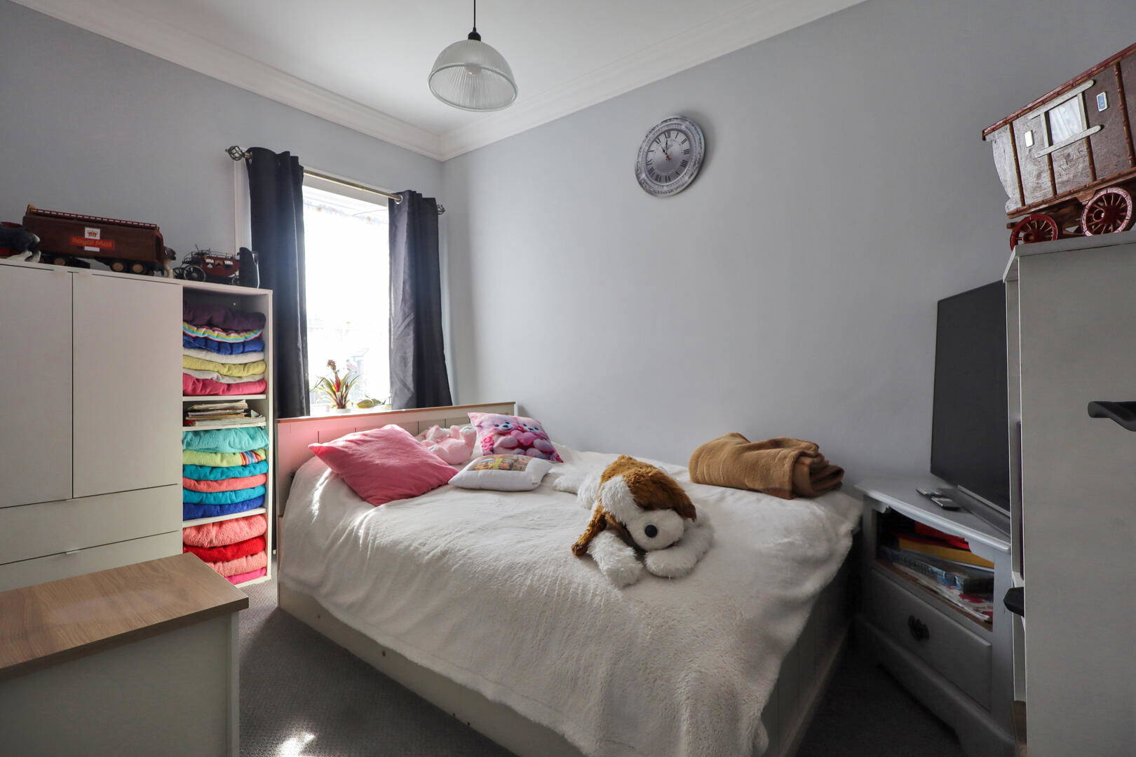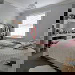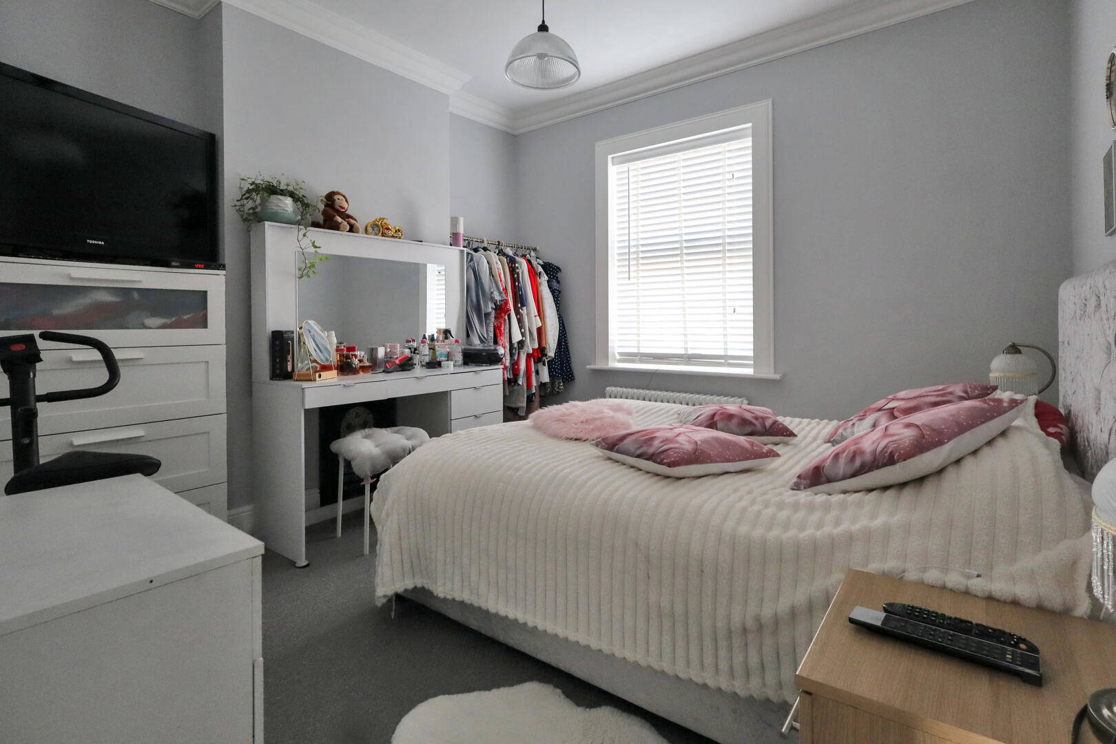 Bedroom 1 is a comfortable double room with a traditional fireplace adding a touch of character and period charm. This peaceful retreat is neutrally decorated with soft grey walls and carpeting, enhanced by a large window that lets in plenty of natural light, creating a bright and airy atmosphere.