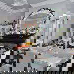 The dining room offers a lovely space to enjoy meals, featuring a classic black fireplace with a decorative tiled hearth that adds character and charm. The room is connected to both the lounge and kitchen, with plenty of natural light flowing through. Neutral tones and tasteful details give the room an inviting atmosphere, perfect for family dining or entertaining guests.