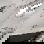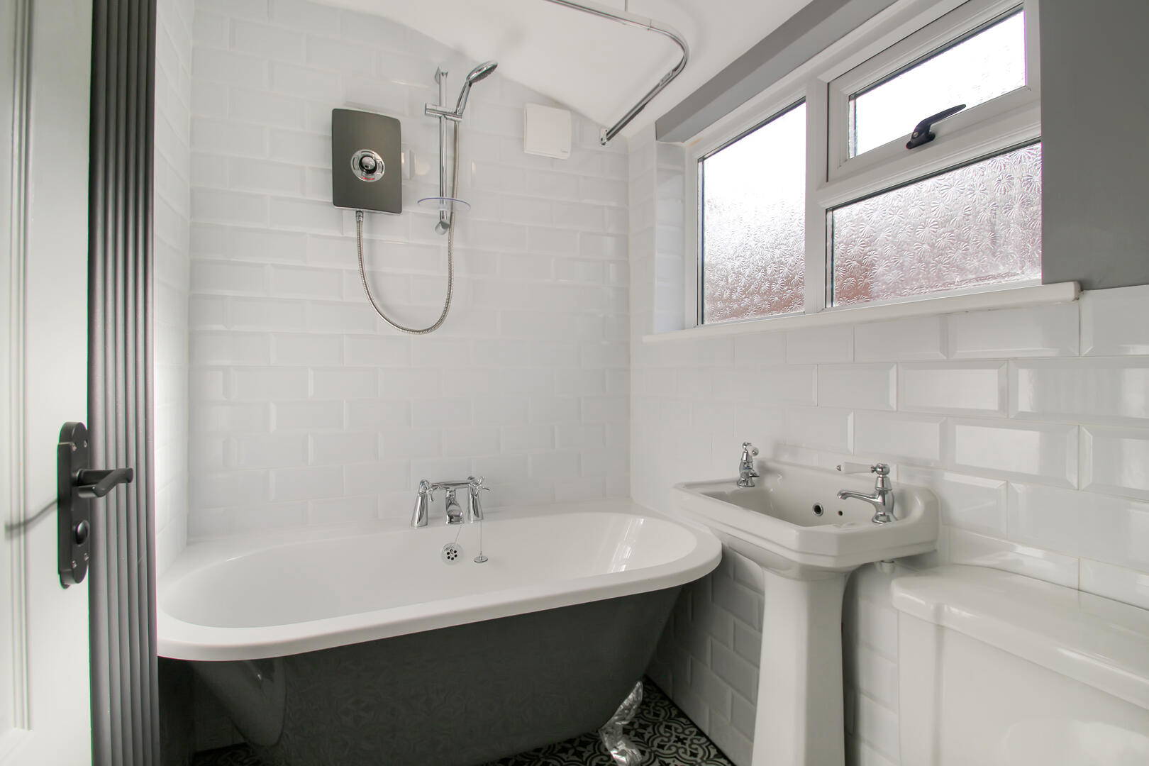 The bathroom features a classic freestanding bath with a traditional style mixer tap and overhead shower. Walls are tiled with white subway tiles, creating a clean and fresh look. The space includes a pedestal basin and toilet, with two frosted windows providing privacy and natural light. Underfoot, patterned floor tiles offer a charming contrast to the crisp white walls.