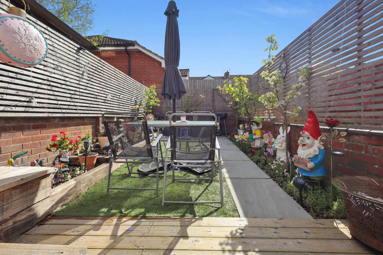 The rear garden provides a private outdoor space featuring a combination of decking, paved pathways, and gravel areas. High wooden fencing surrounds the garden, ensuring seclusion. There is space for outdoor seating and planting beds, creating an inviting and manageable garden perfect for relaxing or entertaining in the warmer months.