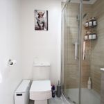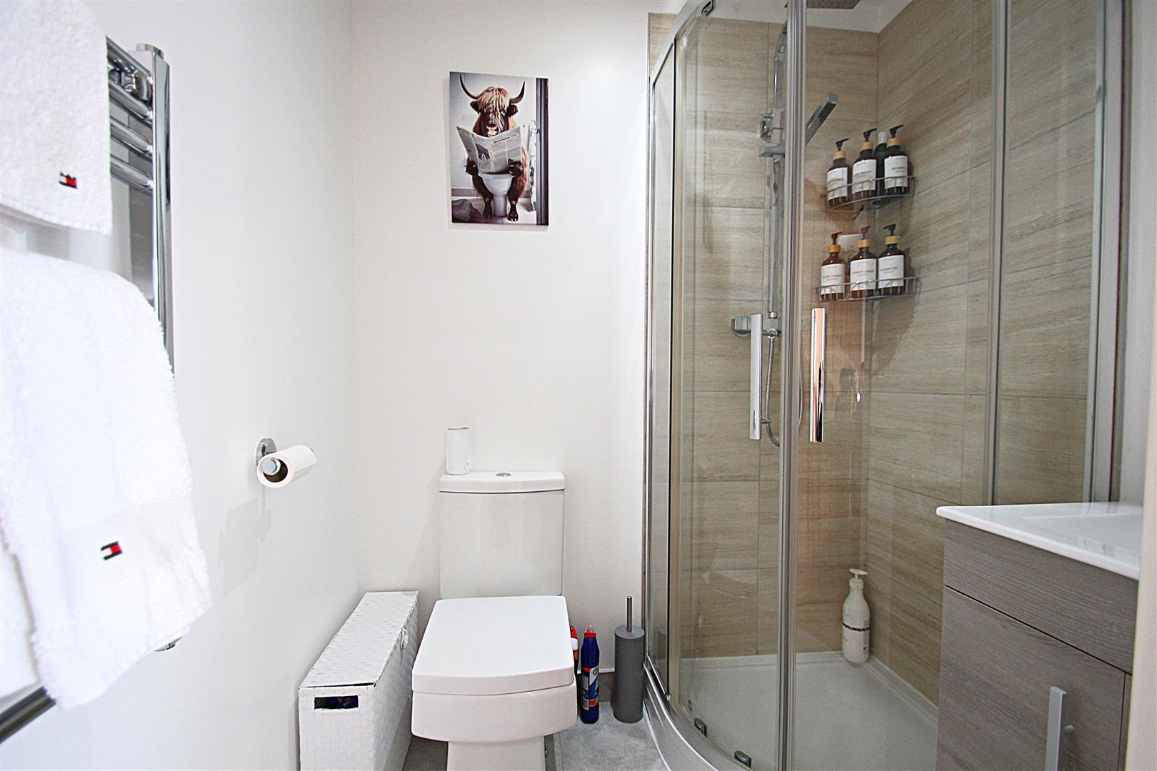 The kitchen is equipped with a comprehensive range of contemporary high-gloss units, which include an integrated fridge/freezer, washing machine, oven, hob, extractor, and granite work surfaces. The double bedroom boasts bespoke built-in wardrobes, and there is a contemporary shower room with a wall-hung vanity sink.