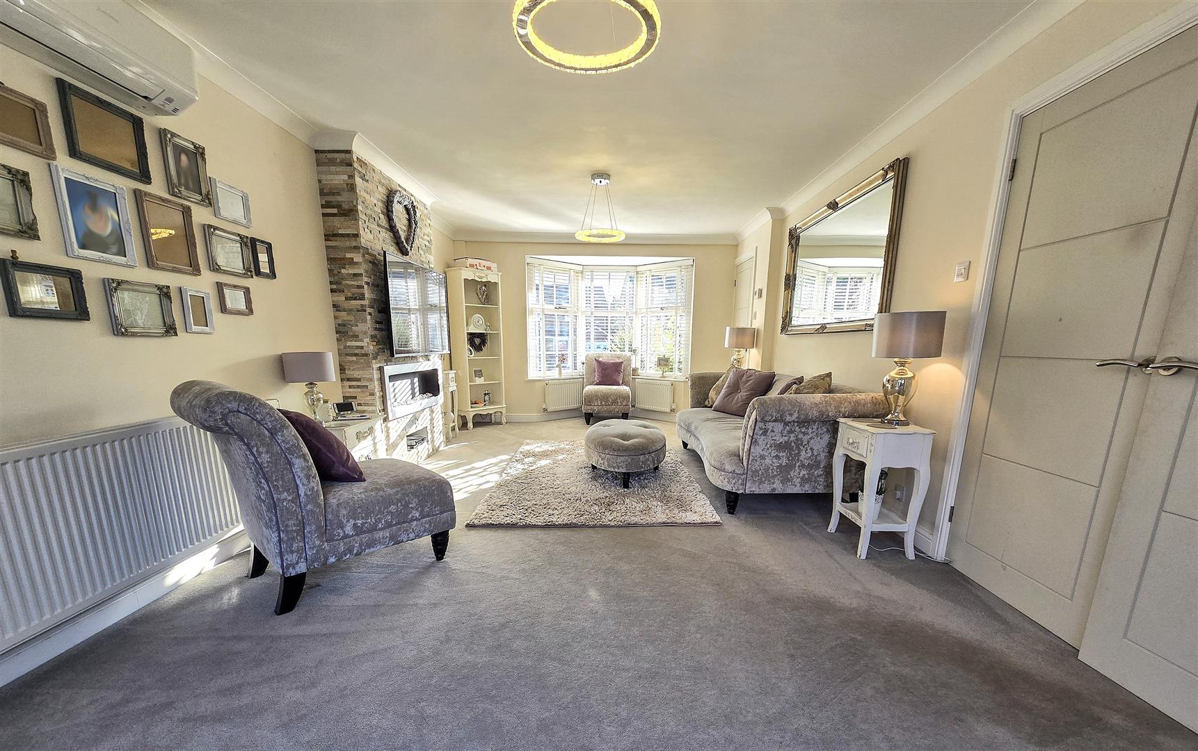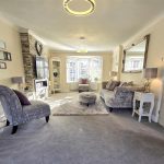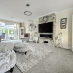 The lounge and dining area is a spacious, inviting room filled with natural light from a large bay window and further illuminated by the adjoining conservatory. It features a feature wall with stone cladding that houses a modern electric fireplace beneath a mounted TV, creating a cosy yet contemporary focal point. Soft carpeting and neutral decor provide a warm, comfortable atmosphere, complemented by elegant furnishings and display shelving that add character to the space.