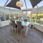 This bright conservatory extends the living space with ample windows on all sides, bathing the room in natural daylight. It has a clean, fresh feel with light-coloured walls and dark wood-effect flooring. The white dining table and grey high-backed chairs make this an ideal setting for casual dining or afternoon tea while enjoying views of the garden. Double doors lead out to the outside, enhancing the flow between indoors and outdoors.