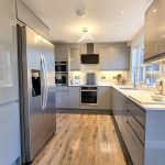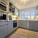 The kitchen is a sleek, modern space fitted with high-gloss cabinetry in a soft grey tone and complemented by wood-effect flooring. It offers a range of integrated appliances including an oven, microwave, and coffee machine, arranged to maximise efficiency. The large window above the sink provides a pleasant outlook and brings in plenty of daylight. Recessed ceiling lights add to the bright and airy feel of this well-equipped kitchen.