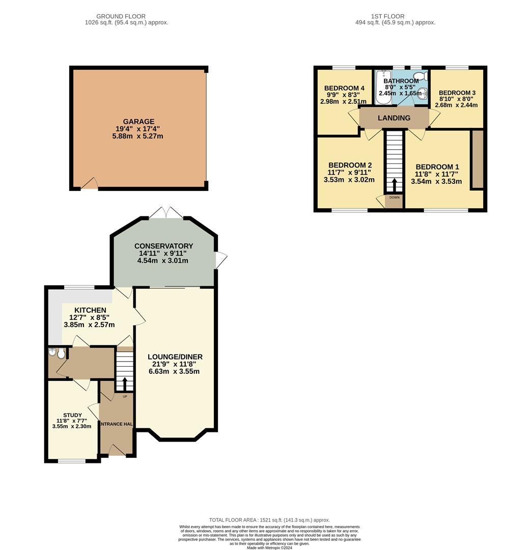 The first floor houses four generously sized bedrooms, including a master suite and a second bedroom, both equipped with fitted wardrobes for ample storage. The family bathroom is well-appointed, featuring a shower over the bath for added convenience.