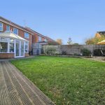 The rear garden is a well-maintained outdoor space featuring a level lawn bordered by planting beds and a raised deck area that connects to the conservatory. The garden is enclosed by fencing, offering privacy and a safe environment. It provides an ideal space for outdoor relaxation or family activities.