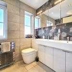 The family bathroom is fully tiled in a modern grey scheme with contrasting dark hexagonal tiles on one wall. It is equipped with a wide vanity unit with twin sinks, a wall-mounted WC, and two windows that fill the room with natural light. The overall effect is sleek, contemporary, and practical.