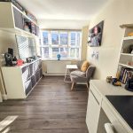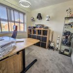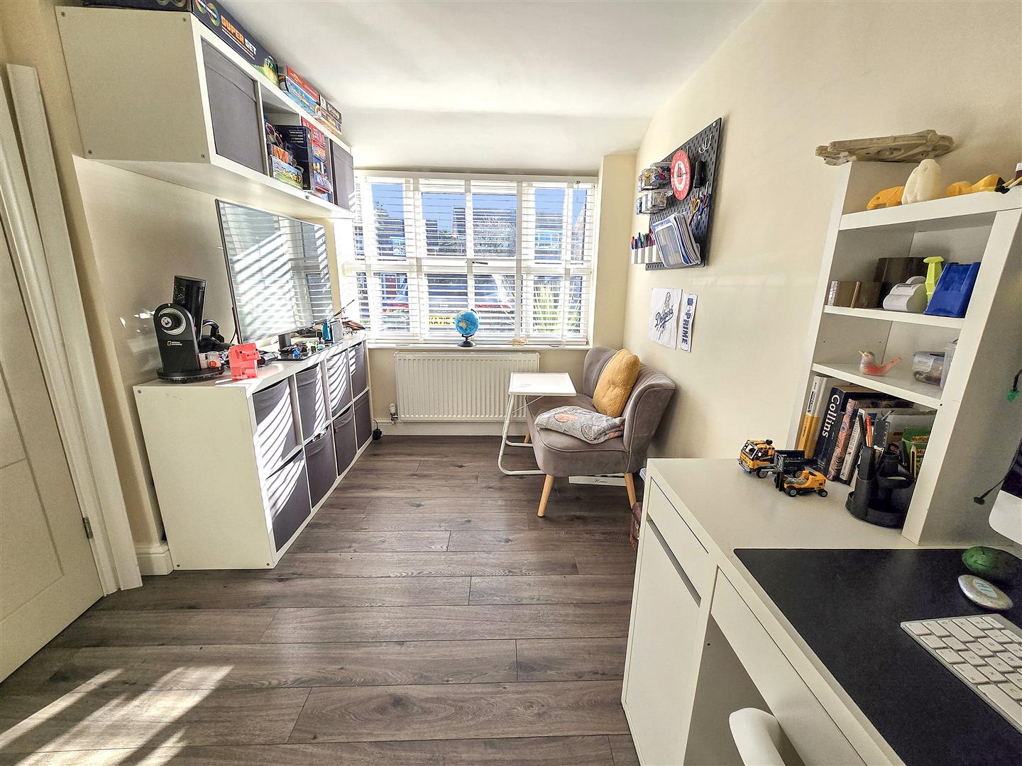 The study is a quiet, well-lit room with wood-effect flooring and neutral walls. Furnished with a large desk and shelving, it offers plenty of storage and workspace, making it ideal for working from home or studying. The window allows natural light to brighten the room, creating a pleasant environment for concentration.