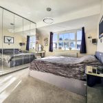 Bedroom 1 is a spacious and bright room featuring a large window that floods the space with natural light. Neutral carpeting and walls create a calming atmosphere, complemented by fitted mirrored wardrobes that provide excellent storage while enhancing the sense of space. The room is styled with modern fixtures and black bedside lighting, making it a tranquil retreat.