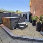 The garden courtyard is a low-maintenance area paved with stone slabs and a gravelled section that hosts a large hot tub with steps for easy access. This private outdoor space is bordered by fencing and includes a shed, making it perfect for relaxing or entertaining in comfort.