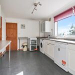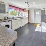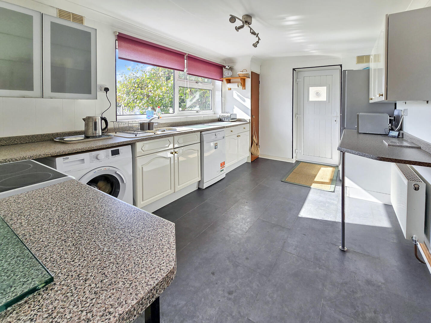 The kitchen is well-equipped with a range of cream cabinetry and contrasting work surfaces. A large window above the sink provides garden views and plenty of daylight. The room has a practical vinyl floor and a door leading to the side of the property.