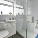 The shower room is fitted with a walk-in enclosure featuring a glass door, a vanity sink with under storage, and a close-coupled WC. The room is finished with light-toned wall panels and a window for ventilation and natural light.