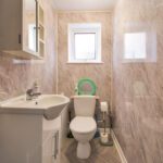 Conveniently positioned off the hallway, the ground floor WC is fully aqua boarded with a modern, glossy finish. It comprises a close-coupled toilet and a compact wash basin with storage cupboard beneath, illuminated by a frosted window providing natural light.