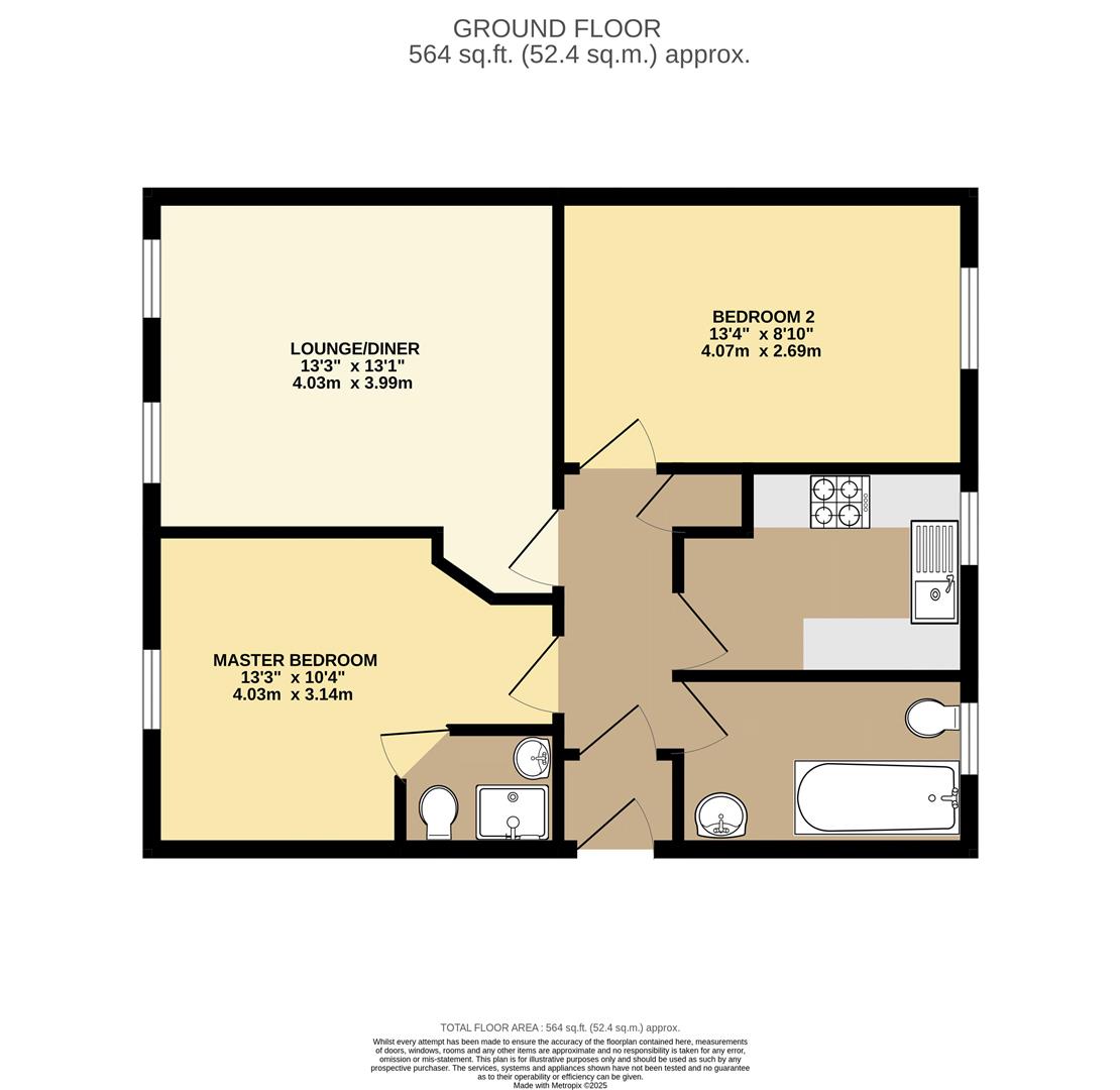 The accommodation includes an entrance hall, a lounge/diner, and a fitted kitchen equipped with a built-in gas hob and oven. There are two well-proportioned bedrooms, with the master benefiting from an en-suite shower.