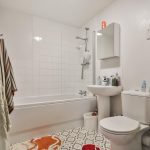 The bathroom is well-appointed with a white suite including a bathtub with overhead shower, pedestal basin, and toilet. The tiled area around the bath contrasts softly with the patterned floor tiles, adding character while maintaining a fresh, clean feel.