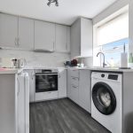 Upon entering, you are greeted by a welcoming entrance hall that leads into an open plan living area, designed to maximise space and light. The contemporary fitted kitchen is equipped with essential appliances, including a washer/dryer and a built-in oven with a gas hob, making it a practical choice for modern living. The living area is perfect for both relaxation and entertaining, offering a comfortable space to unwind.