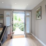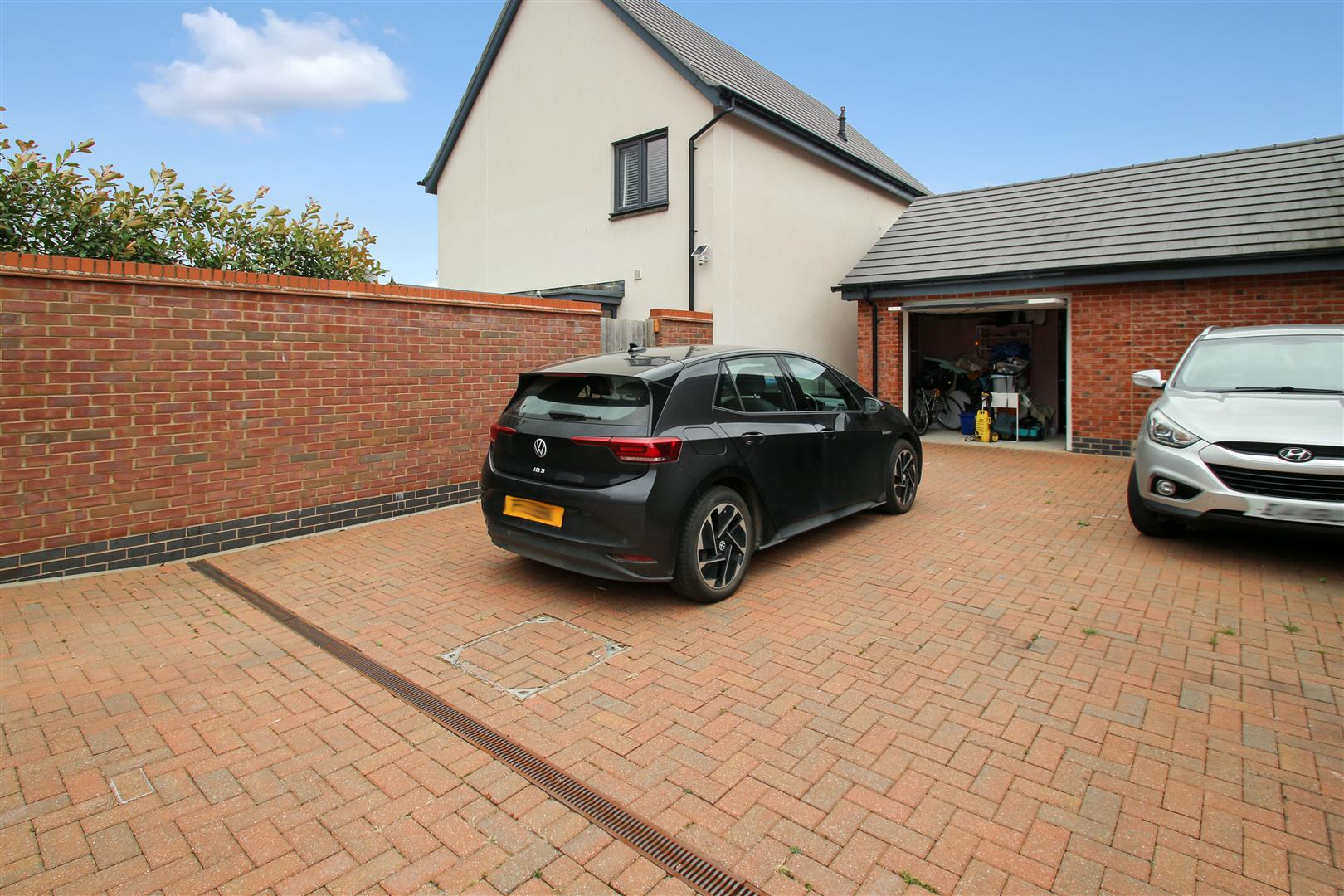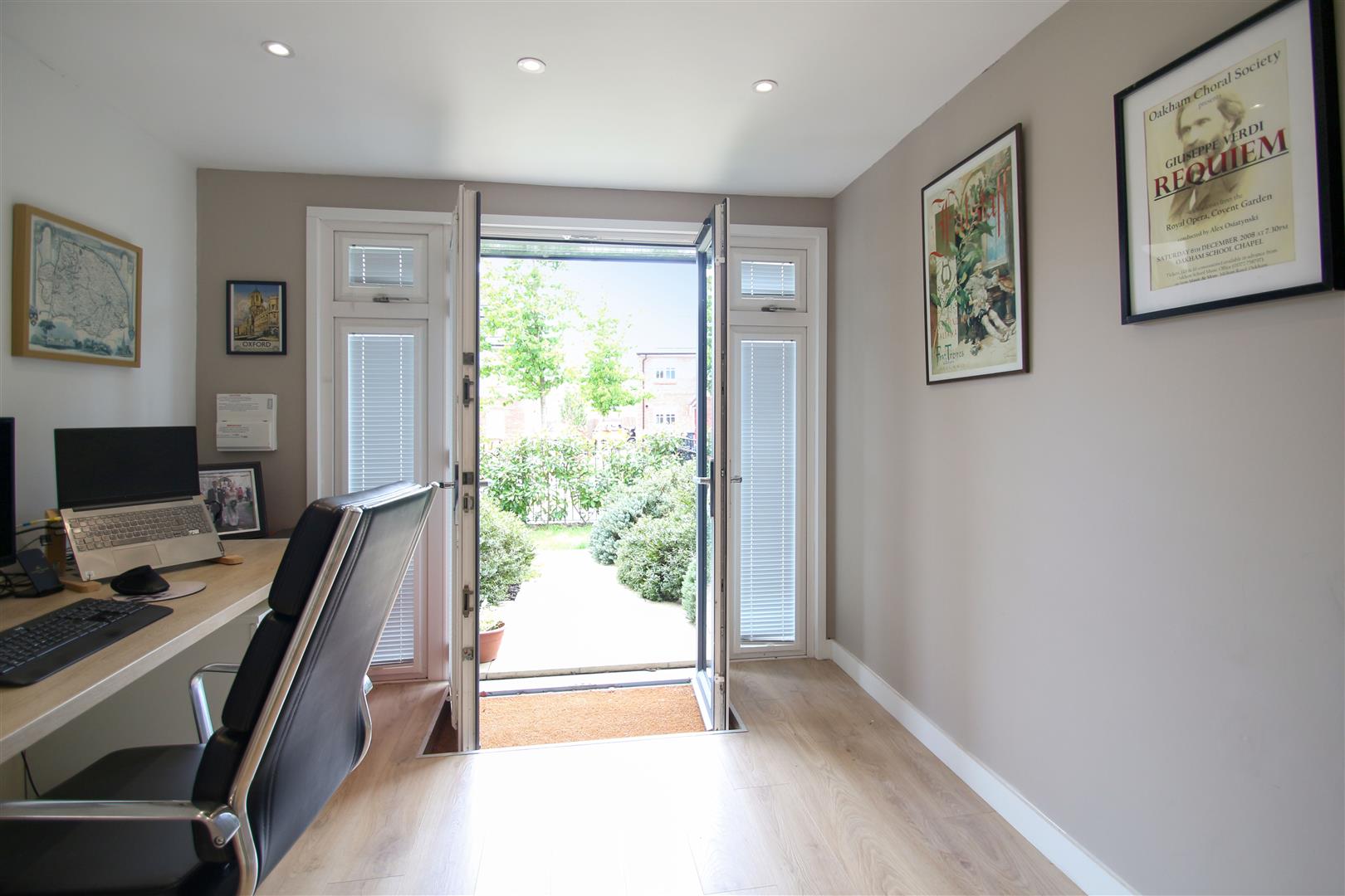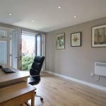 This office room is bright and airy, accessible from the front, and features wood-effect flooring along with neutral-coloured walls. It has double doors that open out, creating a pleasant and productive workspace filled with natural light. The rear section, which serves as a garage, is partitioned off for additional storage and includes an EV charging point.