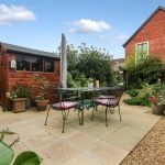 A well-maintained rear garden featuring a paved patio area with seating for outdoor dining. The garden is bordered by gravel and filled with a variety of mature plants and shrubs, creating a peaceful and private outdoor space. A garden shed is positioned at one end, offering useful storage.