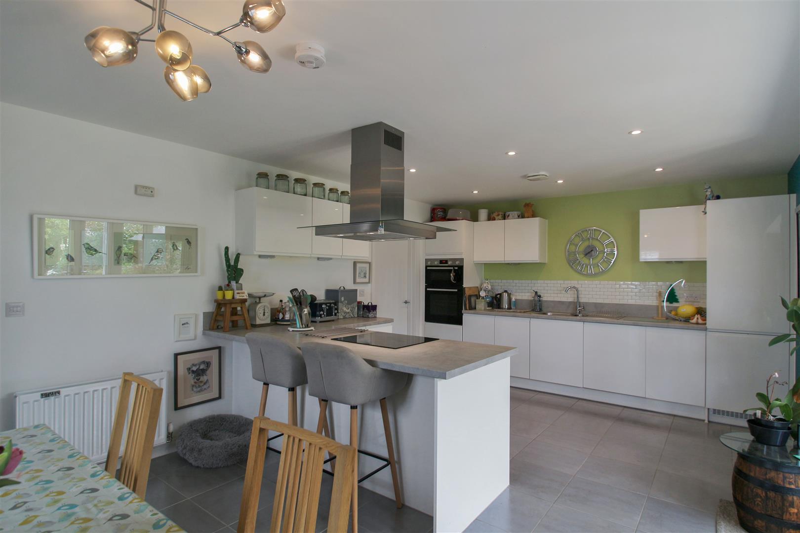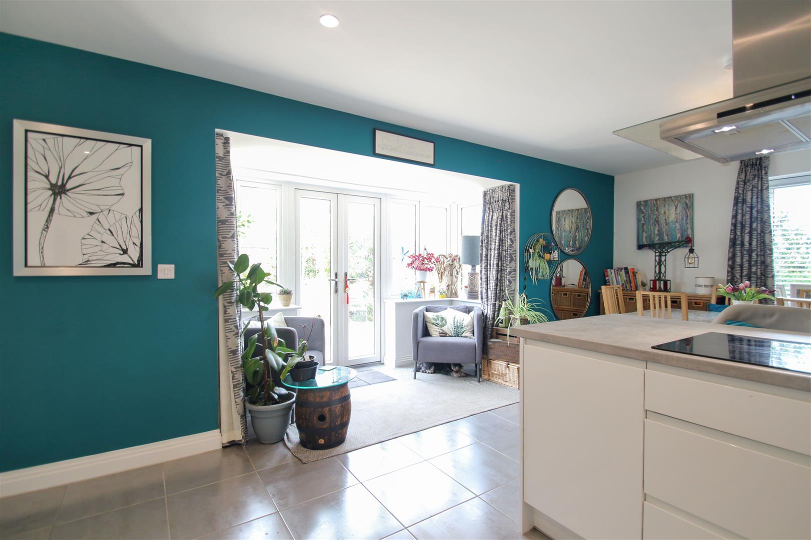A modern dining kitchen combining a stylish cooking area with a dining space. It features sleek white cabinetry paired with a light grey worktop island that doubles as a breakfast bar with seating for three. The kitchen is enhanced by a striking teal accent wall and a large set of French doors that open onto the garden, allowing for plenty of natural light. Beyond the kitchen is a utility room with white units and a sink, providing practical space for additional household tasks.