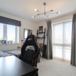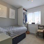 A smaller bedroom with a window fitted with curtains. The room is suitable for a child’s room or study.