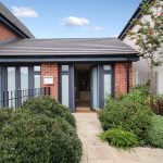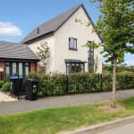 The front exterior of the property displays a modern design with part brick and rendered walls, tasteful landscaping including mature hedges and shrubs, and a fenced boundary. The house sits neatly on a corner plot in a well-kept residential area.