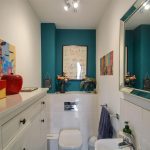 A well-equipped ground floor cloakroom featuring a close-coupled WC and a small washbasin. The walls are decorated with teal paint above white tiling, giving a fresh and clean appearance.