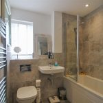 A family bathroom with a bathtub and shower over, a wall-mounted basin, and a close-coupled WC. The walls are tiled in a neutral tone, creating a clean and modern look. A window provides natural light and ventilation.