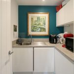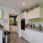 A compact and functional utility room adjacent to the kitchen, fitted with white cabinets and a sink, ideal for laundry and additional kitchen storage. The room has a bright teal feature wall that adds a splash of colour and character to the space.