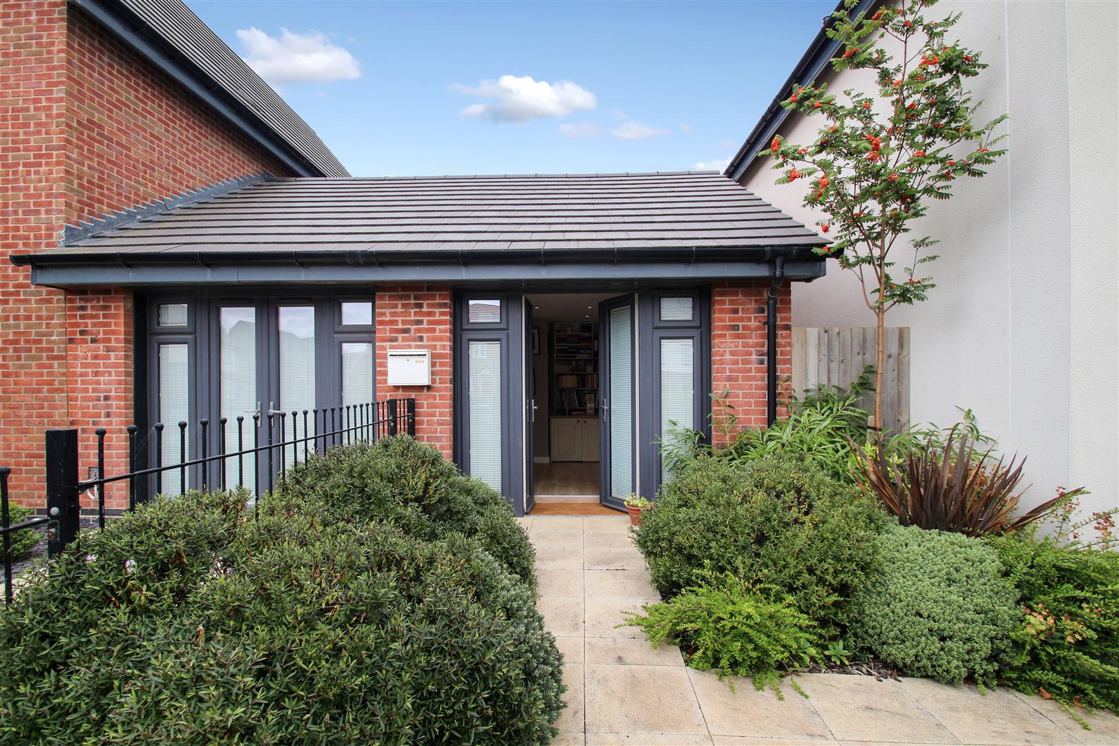 A neat and welcoming pathway garden area at the front of the property, with paved walkways bordered by well-tended shrubs and plants, adding to the overall charm and curb appeal of the home.