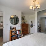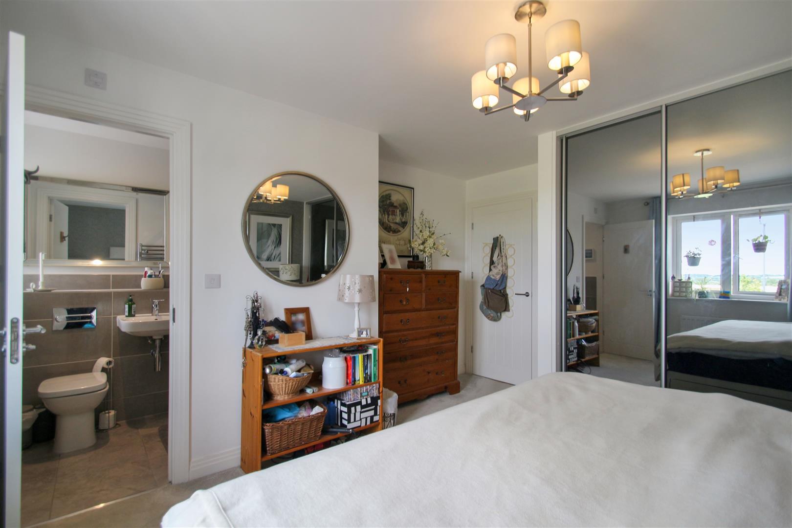 A peaceful bedroom with a large window that lets in plenty of natural light. It is carpeted and decorated in soft, neutral tones, making it a restful space. There is a built-in wardrobe with mirrored sliding doors providing practical storage, and the room leads to an ensuite bathroom.