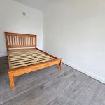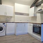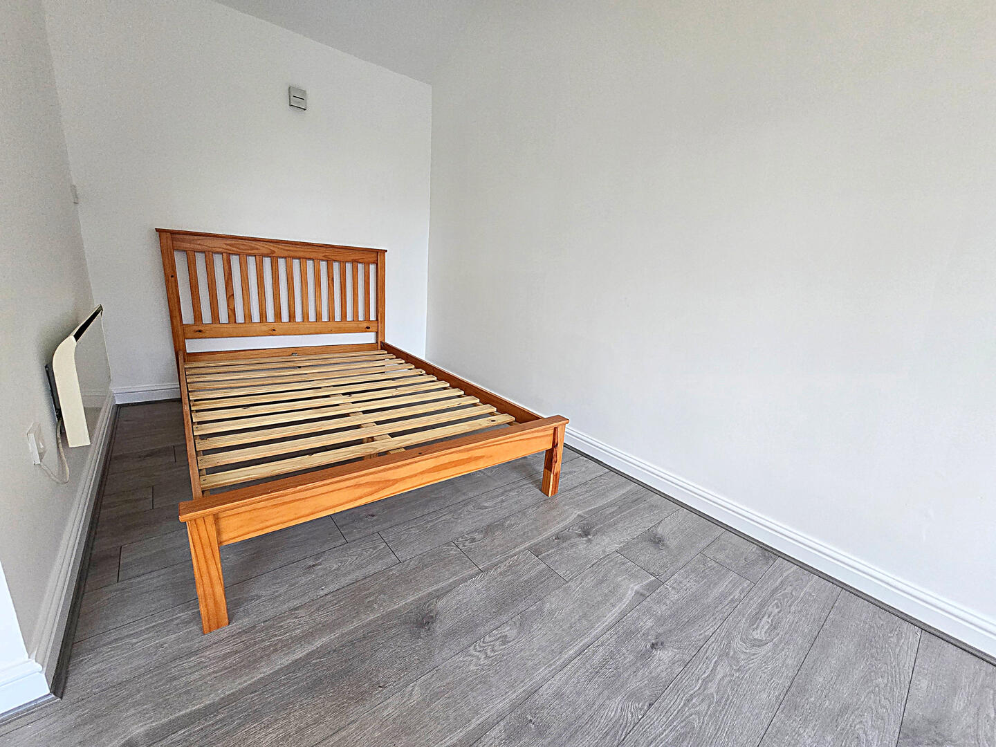 The bedroom area is equipped with a double bed frame, providing a restful retreat after a long day. The fitted kitchen is a highlight of the apartment, complete with essential appliances such as a built-in oven and hob, an integrated fridge, and a washing machine, making it ideal for both cooking and convenience.