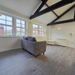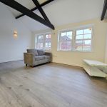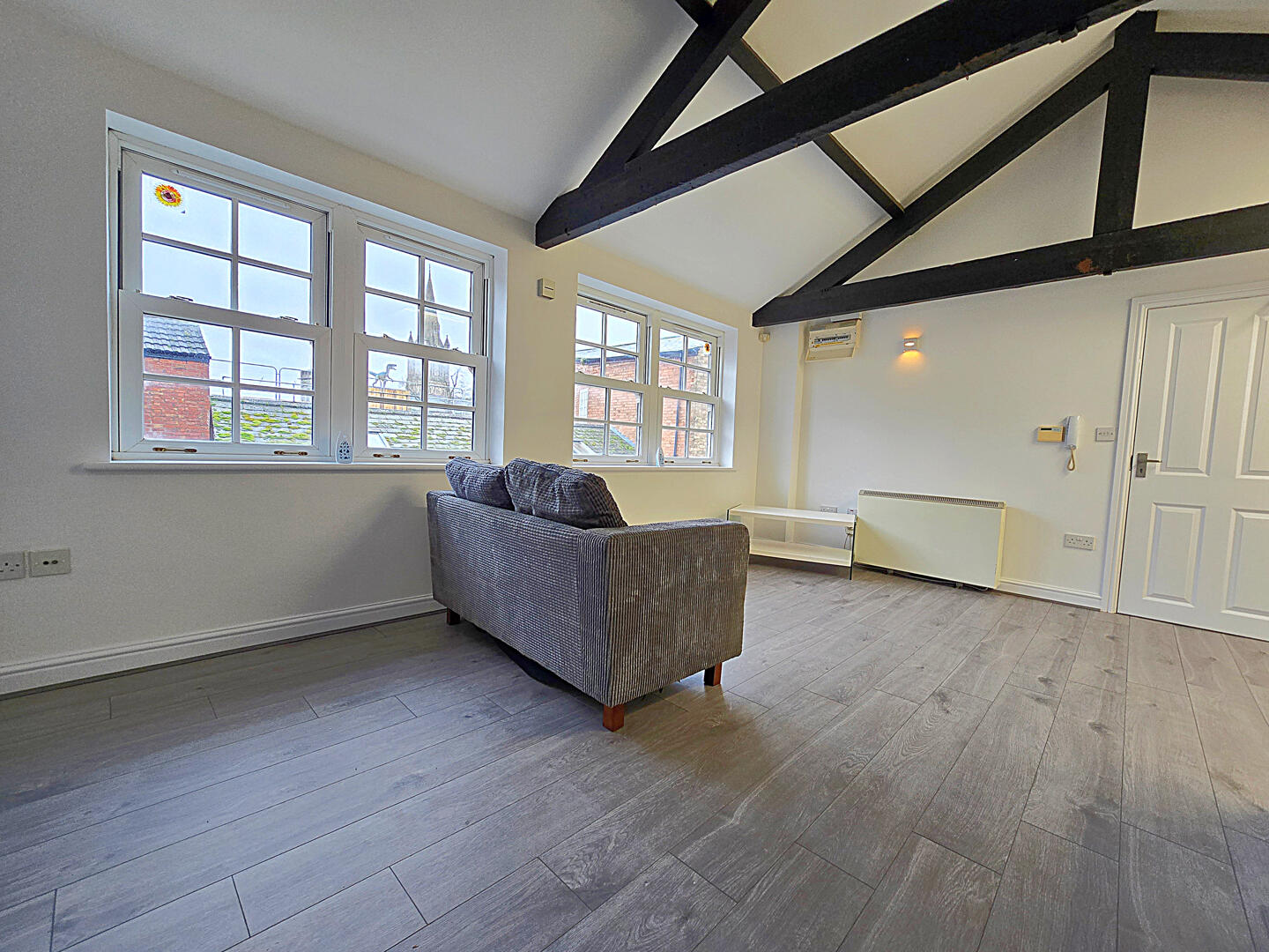 Modern second-floor studio apartment located in the heart of Rugby Town Centre. This part-furnished property offers a delightful open-plan living space, perfect for those seeking a contemporary lifestyle. The living area is thoughtfully designed, featuring a comfortable sofa and a stylish coffee table, all set upon elegant laminate flooring that enhances the sense of space and light.